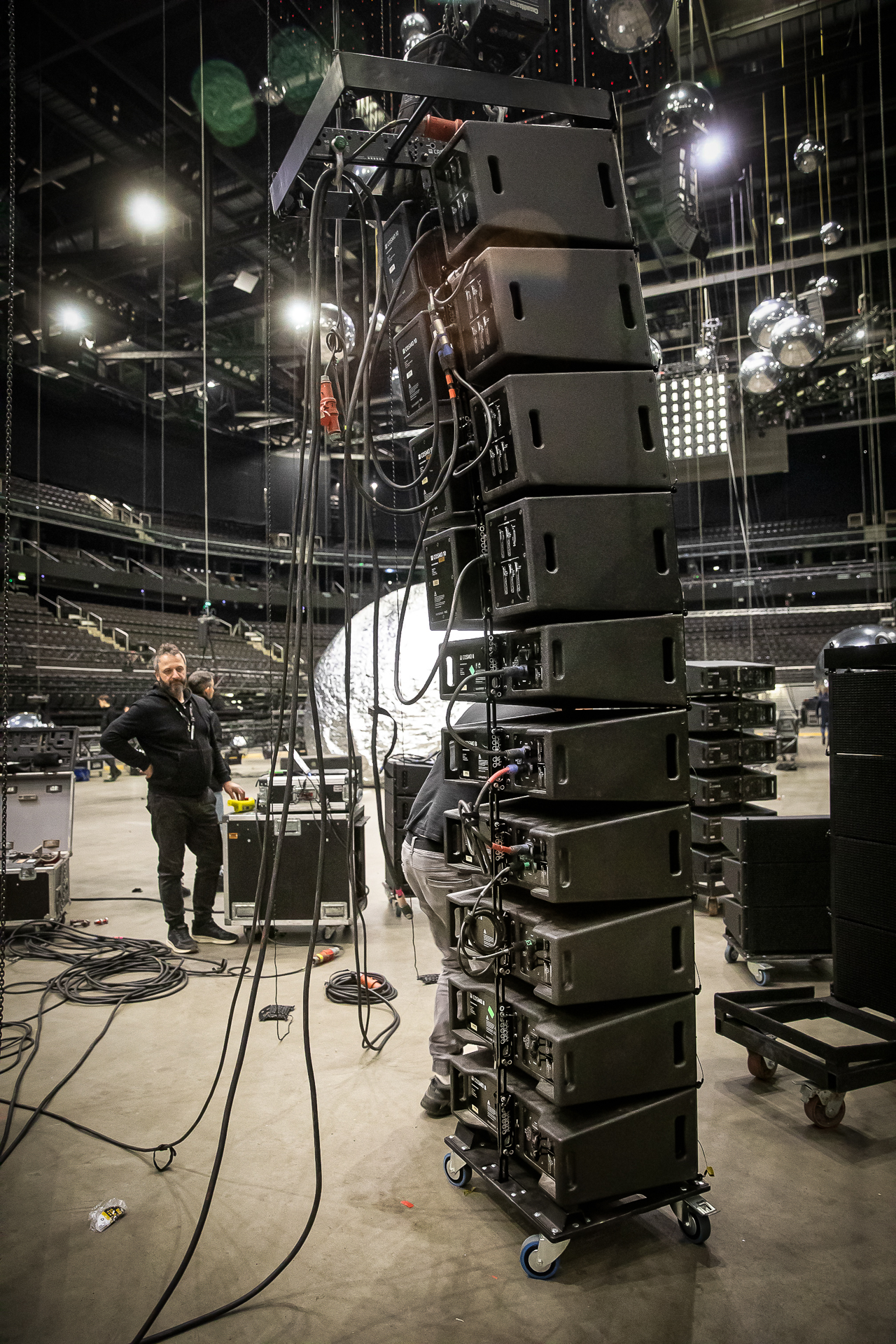 „Die großen silbernen Kugeln waren akustisch zunächst nicht hilfreich, aber wir fanden die richtigen Positionen und schafften es, dass es funktionierte“, sagt Aurimas Mitkus, Front-of-House-Techniker für „Stichijos 2: Pasadoblis“. „Letztendlich erreichten wir eine stabile Abdeckung, sodass jeder in der Arena den Klang genießen konnte.“